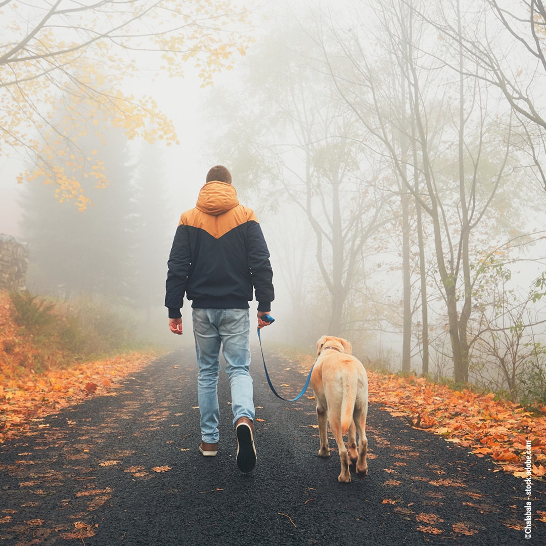 Vermeidet bei dichtem Nebel unübersichtliche Straßen oder stark befahrene Wege. Wählt lieber bekannte Routen mit gutem Untergrund und ausreichender Beleuchtung. Auf offenen Feldern, Wald- und Wiesenwegen kann der Nebel besonders dicht sein – hier empfiehlt sich, den Hund an der Leine zu lassen, um ihn immer in eurer Nähe zu wissen.